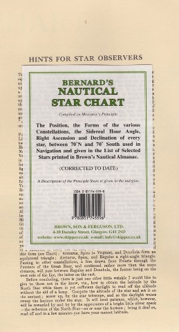 Browns Nautical Star ChartA Practical Star Chart, 914 X 584 mm, for the Practical Seaman, constructed on Mercator's principle, showing all the stars used in navigation. The brightest stars are conspicuously marked with yellow.The chart can be used at any time in any part of the world to find what stars will be visible, or to identify an unknown star, and forms an excellent substitute for the well-known Star Globe.To the navigator, accustomed to terrestrial charts, the use of the Star Chart is simplicity itself. Plot your position, i.e. the position of your zenith on the chart, using the D. R. latitude, and instead of the longitude, the Local Sidereal Time. What stars are visible and their approximate bearings are seen at a glance, and their approximate altitudes can be measured with dividers on the scale on the chart.There are seven small charts to help in identifying important stars and a guide to the pronunciation of star names.