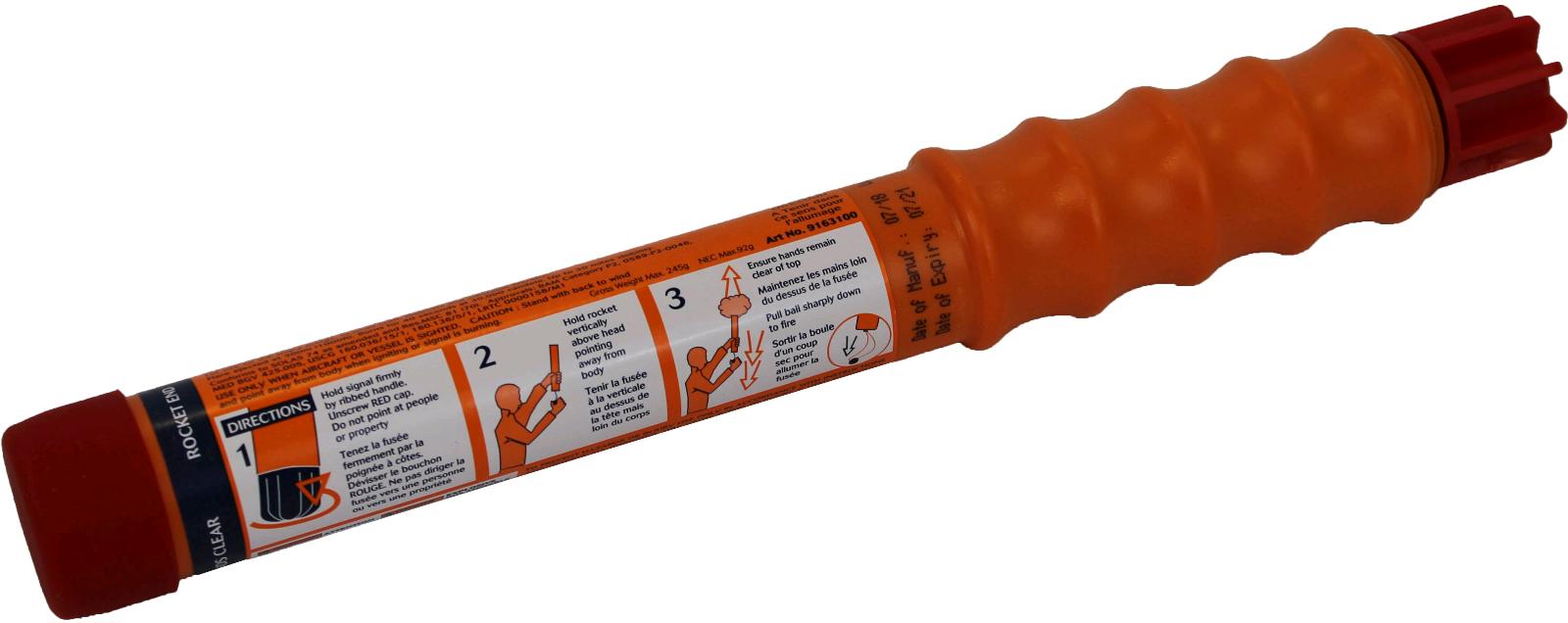 Long range,day and night distress signalling rocket. Designed to withstand exceptional environmental exposure and to perform reliably even after immersion in water. Features improved grip for easy handling and conforms to SOLAS 74/88 as amended. Rocket propels a red flare attached to a parachute to 300m and burns for 40 seconds. SOLAS requires that 12 rockets are carried on Ships Bridge and 4 rockets are fitted in liferafts and lifeboats. Also used by leisure craft.Length: 295 mm (11.6 inches)Diameter: 32 mm (1.3 inches)Weight: 235 g (8.3 oz)Altitude: 300 m (984 feet)Net Explosive Content: 84 g (3.0 oz)Light Color: RedLight Burn Time Minimum: 40 secondsLight Intensity: 30.000 candela
