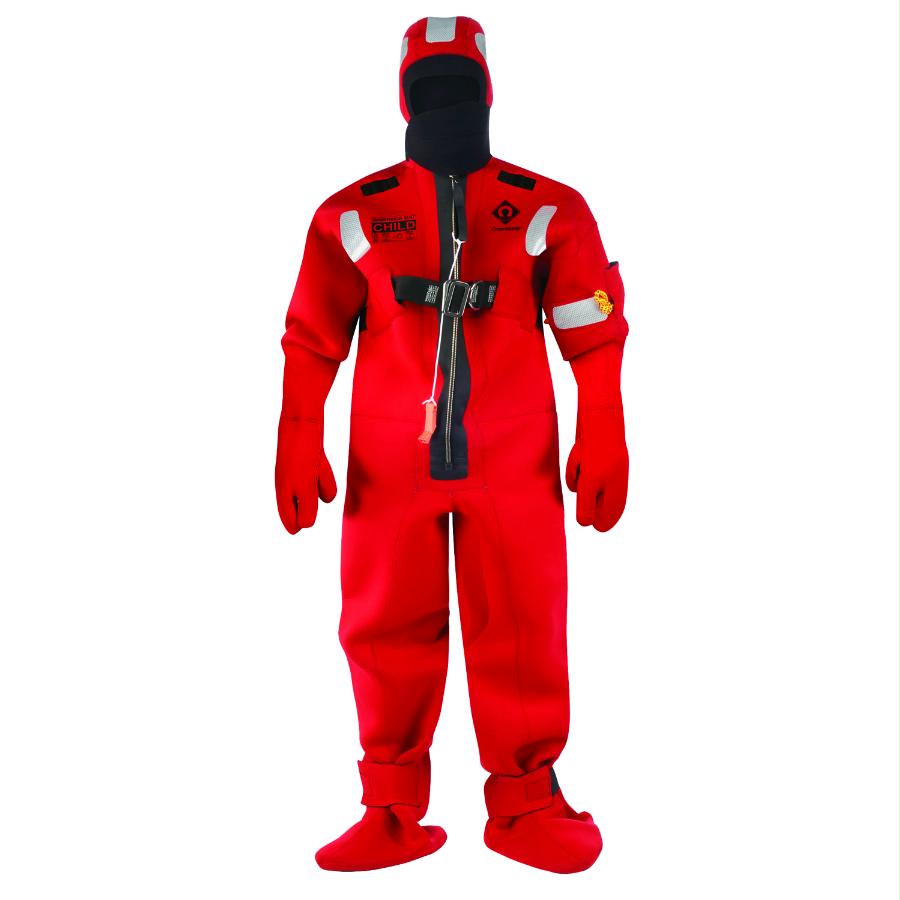 Crewsaver immersion suits are fully approved to the current SOLAS MED regulations. They are made from 5mm fire retardant neoprene to provide good insulation and resistance to oil, sunlight and seawater. Quick and easy to put on, each is supplied in its own carry bag with donning instructions included. All seams are glued and blind-stitched to ensure they are totally waterproof. Critical areas are taped for additional reinforcement and the foot sole is reinforced. The suit also provides thermal protection. The neoprene immersion suit should be used with an approved lifejacket.FEATURES:• Unpacked and donned in under 2 minutes• 5mm 3 finger neoprene gloves, hood and boots• 50mm nylon lifting strop harness with stainless steel d-ring• Waterproof zip and med/solas approved reflective tape• 5mm neoprene face flap and inside chin flap for dual protection• Outer material neoprene withstands the impact of a jump into water from 4.5 m• Fire retardant neoprene construction• Prevents a typical wearer’s core body temperature from dropping by more than 2ºc after six hours in calm water of 0-2 ºcChest 59 - 90 cmHeight 110 - 150 cmWeight 20 - 50 kg