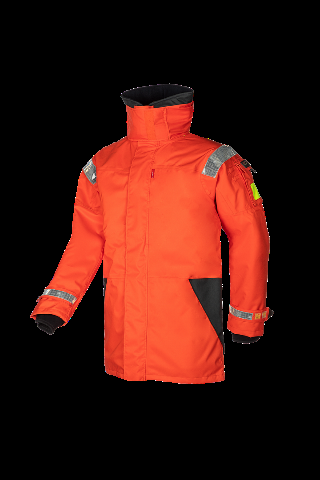 The X6 jacket is designed to fulfil requirements in extreme conditions. It has superior reinforcement panels on seat areas for enhanced abrasion resistance.SUPERIOR BENEFITS:o High abrasion resistance reinforcement panel added to seat areao High collar + extra protective chin strap with touch and close fastening. High-Visibility yellow adjustable insulated peaked hood, with built-in chin and face protection stowed in collaro ID pocket on left sleeveo SOLAS approved retro-reflective tape on hood, upper arms and wristso No chest pockets to minimize snagging hazardsKEY FEATURES:o Fully waterproof outer fabric + taped seamso Anti-flushing straps at armso Collar with flap with touch and close fasteningo Peaked hood foldaway in collaro Zip closure under double flap with touch and close fasteningo 2 set-in handwarmer pockets with T&C fasteningo 1 sleeve pocket with ID pocket & whistleo 2 loops for lighto 1 Napoleon pocket under storm flapo Seat reinforcemento Retro-reflective tape on hood, upper arms, wrists and ankles.o Inner adjustable neoprene wrist seals.INTERIOR:o Marine grade whistleAVAILABLE SIZES:o S o M o Lo XLo XXLo XXXLCERTIFIED:o EN ISO 12402-5: 2006+A1:2010 ; EN ISO 12402-6:2006+A1:2010 +prEN: 2017o EN 343 : 2003 + A1 : 2007 Class 3-1o EN ISO 13688 : 2013COLOUR:o 714 Orange/Navy/Hi-Vis Yellow