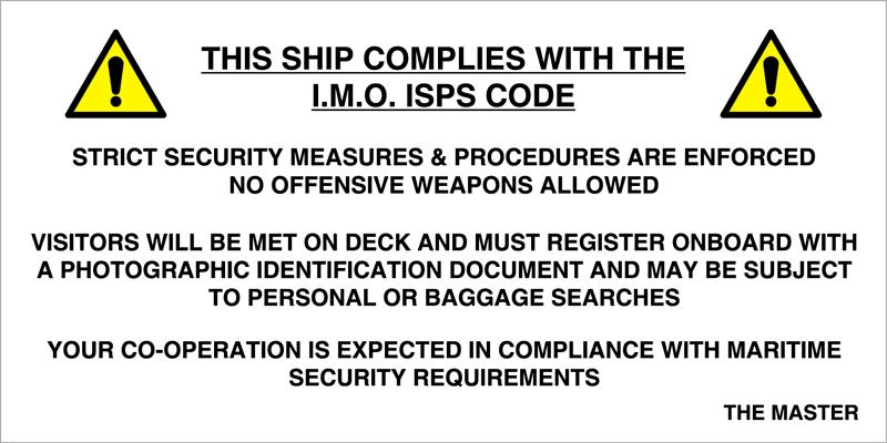 ISPS sign; "This Ship complies with the I.M.O. ISPS code. Strict security measures & procedurese ar