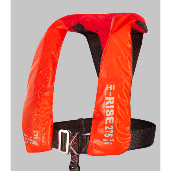 Ultrafit horseshoe design 275 Newton double chamber inflatable life jacket. Ideal for heavy duty offshore use with foul weather clothing and heavy equipment.SUPERIOR BENEFITS:o Designed to combine optimum safety and comforto The shape of the bladder is tailored to the contours of the wearer to create a snug secure fit whilst giving supreme in-water performanceo Stylized horseshoe design with offset shoulder straps to alleviate weight and pressure stress on neck and shoulderso The bladder has a unique hinged head pillow for optimal comfort and head support in waterKEY FEATURES:o Durable waterproof fabrico Durable wipe clean PVC reinforcemento Double shoulder straps for comfort and reduction of weight to the back neck.o Zip fastening covero Stainless steel interlocking belt buckleso Adjustable waist belto Detachable crutch strapo Integrated deck safety harness approved to EN ISO12401INFLATABLE BLADDER:o Double chambero Oral inflation tube on back chamber and Over pressure tube + relief valve on front chamber for manual inflation and deflation and also to relieve any excess pressure if both chambers are fired simultaneouslyo SOLAS approved retro-reflective tape on bladdero Red recovery grab strap on bladder marked "LIFT"o 2 x 60g CO2 gas cylinderso Automatic water-activated SOLAS S.O.S. lighto 2 x Inflation systemso Marine grade whistleo Buddy lineACTUAL BUOYANCY:320NAVAILABLE SIZES:o UniversalCERTIFIED:o SOLASo EN ISO 12402-2 : 2006 +A1 : 2010 for inflatable lifejackets performance level 275o EN ISO 12401 : 2009COLOUR:o RS0 Red