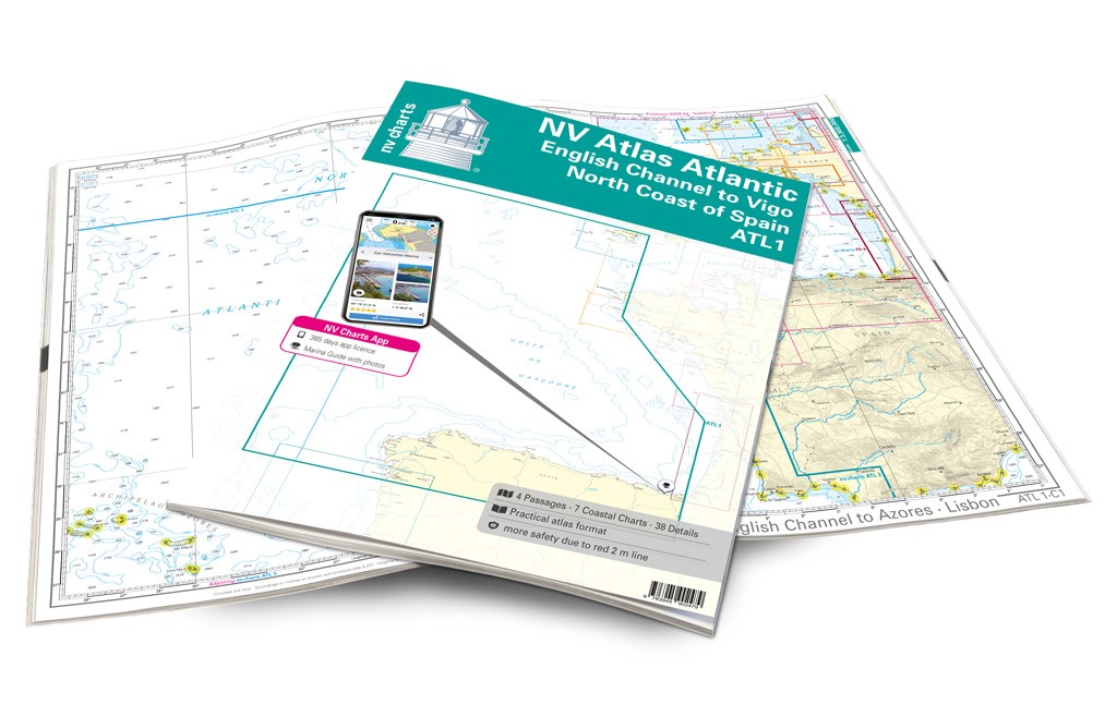 The ATL 1 chart set is suitable for water sports enthusiasts who want to cross the Bay of Biscay and especially want to explore the north coast of Spain. The charts will accompany you to the north of the Spanish west coast, more precisely to the city of Vigo. Please keep in mind that the average water depth is almost 1800m and that, due to currents and turbulences, you need moderate weather for a safe crossing. Coming from the French coast, there are of course various harbours on the Spanish coast that we cover with harbour plans. Cities like San Sebastian, Bilbao, La Coruna and Vigo are definitely worth a trip if you plan enough time. But also nature lovers will get pleased thanks to the mountain ranges, cliffs and lonely bays of northern Spain.Thanks to the clear structure the skipper can quickly find approaches, harbours and anchorages and is informed of important navigational details that also appear in the NV Charts app. The chart series impresses with its optimal scales and balanced sheet cuts.This chart set includes4 Passage Charts7 Coastal Charts38 Details ChartsCode for the appDigital charts & navigation programmeNavigation instructions in EnglishTide tablesPaper harbour plans & DigitalMeets legal requirements for up-to-date paper charts on board NV Atlas chart format NV Charts nautical charts are available in an outstandingly practical, handy atlas booklet format and thus offer many advantages over formats from other manufacturers. The nautical chart series have been designed by nautical experts and passionate water sports enthusiasts with the needs of recreational boating in mind. The NV Atlas has a very flat staple binding in the middle, so that the course triangle can also be used there without any problems. This innovative development makes it possible to look up charts quickly and always have them in the best possible order at the same scale. The NV Atlas is delivered in a plastic cover protected against splash water. This modern nautical chart format is very popular on sailing boats as well as on motor yachts and is the preferred choice of many of our customers.