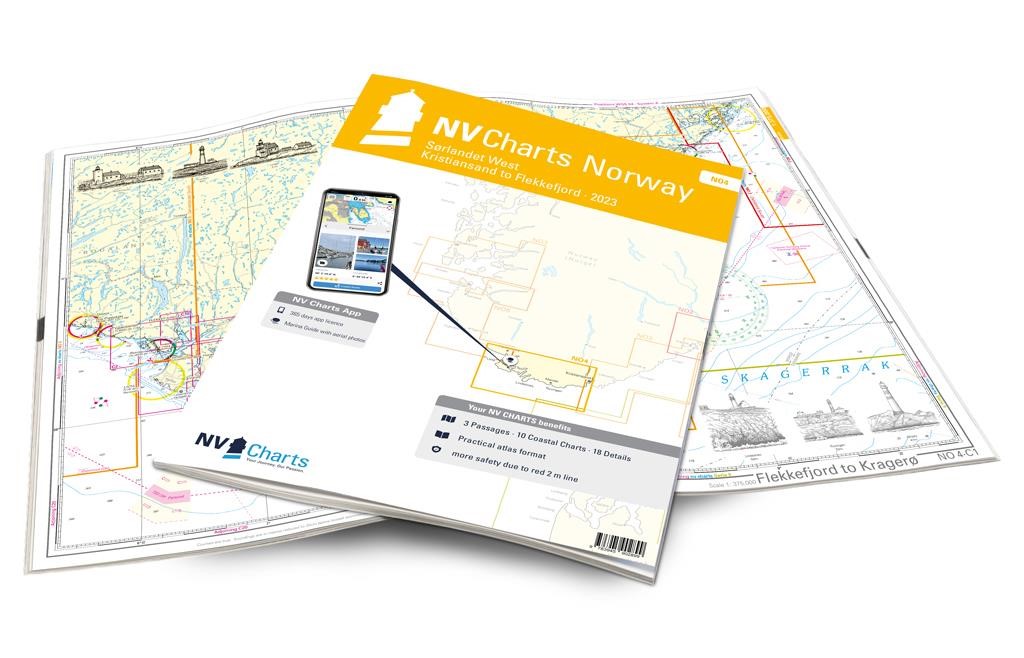 If you want to go directly from North Jutland to the southwest coast of Norway, you should have the NO4 already on board. The southwest coast is the climatically mildest region of Norway and offers with Kristiansand, Ryvingen (southernmost lighthouse of Norway), Lindesnes and the beautiful Flekkefjord a landscape shaped by nature. However, at Lindesnes the Skagerrak meets the North Sea, which you should definitely take into account in your planning.NV charts for the Norwegian coast are based on data from the Norwegian Hydrographic Office and also contain the harbour plans of the “Norske Los” as well as numerous, specially charted details. Thanks to the clear structure, the skipper can quickly find approaches, harbours and anchorages and is informed of important navigational details that also appear in the NV Charts app. The chart series impresses with its optimal scales and balanced sheet cuts.The NV.Atlas comes as usual as a combipack and includes:3 Passage Charts 10 Coastal Charts 18 detailed chartsDigital charts & Navigation programmePaper harbour plans & DigitalNavigation instructions in English and NorwegianNV Charts for the Norwegian coast are based on data from the Norwegian Hydrographic Office and also include the harbour plans of the "Norske Los" as well as numerous extra mapped details.The chart series is structured in such a way that the recreational skipper can find harbours and anchorages at the first go and is pointed to navigationally interesting details of the respective sea area. NV Atlas chart format NV Charts nautical charts are available in an outstandingly practical, handy atlas booklet format and thus offer many advantages over formats from other manufacturers. The nautical chart series have been designed by nautical experts and passionate water sports enthusiasts with the needs of recreational boating in mind. The NV Atlas has a very flat staple binding in the middle, so that the course triangle can also be used there without any problems. This innovative development makes it possible to look up charts quickly and always have them in the best possible order at the same scale. The NV Atlas is delivered in a plastic cover protected against splash water. This modern nautical chart format is very popular on sailing boats as well as on motor yachts and is the preferred choice of many of our customers.