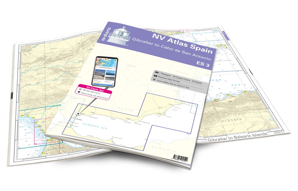 As soon as you have passed one of the busiest waterways in the world, the Strait of Gibraltar, from the west, you should have the ES3 on board. In Gibraltar, the English crown colony, there are several well-frequented marinas where it is advisable to register in advance. For those who like it a little quieter, Puerto de Sotogrande or Puerto de la Duquesa are good alternatives. Here in Andalusia there are ideal climatic conditions. The Mediterranean climate with around 300 days of sunshine a year makes Andalusia look good as a water sports paradise. As soon as one has left Torremolinos and Malaga behind, one arrives at the sparsely populated Costa Tropical, Costa Almeria and the Costa Calida. There are charming bays, mountain ranges such as the Sierra Nevada in the background and opportunities to visit smaller harbours everywhere. The very touristy Costa Blanca has two starting points with Alicante and Denia, from which you can get directly to the Balearic island of Ibiza.Thanks to the clear structure the skipper can quickly find approaches, harbours and anchorages and is informed of important navigational details that also appear in the NV Charts app. The chart series impresses with its optimal scales and balanced sheet cuts.This chart set contains1 Passage Charts10 Coastal Charts30 Details ChartsCode for the appDigital charts & Navigation programPaper port charts & DigitalNavigation instructions in EnglishMeets legal requirements for up-to-date paper charts on board NV Atlas chart format NV Charts nautical charts are available in an outstandingly practical, handy atlas booklet format and thus offer many advantages over formats from other manufacturers. The nautical chart series have been designed by nautical experts and passionate water sports enthusiasts with the needs of recreational boating in mind. The NV Atlas has a very flat staple binding in the middle, so that the course triangle can also be used there without any problems. This innovative development makes it possible to look up charts quickly and always have them in the best possible order at the same scale. The NV Atlas is delivered in a plastic cover protected against splash water. This modern nautical chart format is very popular on sailing boats as well as on motor yachts and is the preferred choice of many of our customers.