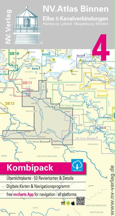 The most exciting waterways can be found in Inland Volume 4 of NV Charts. The Elbe the Elbe-Lübeck Canal the Mittelland Canal and the Elbe-Seiten Canal are all highly frequented waterways with plenty of commercial shipping. This should be taken into account in any case. In addition there are countless motorboats from the Mecklenburg and Brandenburg areas. You can reach the Baltic Sea directly via the Elbe-Seitenkanal or further downstream to the North Sea via our beautiful Hanseatic city of Hamburg. The chart set consists of 53 district and detailed charts.The NV Sportschiffahrtskarten Binnen are a set of coloured charts at a scale of 1:35 000 specially designed for inland waters. The charts were developed according to the concept of being practical to use and precise in the information they provide. Large-scale details and tightly written texts provide information on water depths passage heights locks moorings and places of interest. An index and an overview map make finding the area quick and easy. An emblem on each page reveals the location in the area. The logical clear layout facilitates orientation as does the kilometre marking in the map margin. Dangerous spots highlighted in red and views of prominent points round off the multi-volume map series.