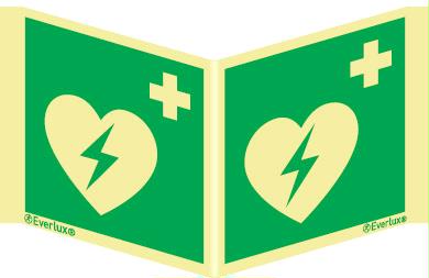 Panoramic Safety sign, photoluminescent rigid plate, self-adhesive, Symbol: AED - 15x15 cm