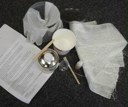 Contains:Polyester resin 250 mlHardener 10 mlGlass-sheeting for stiffnessGlass tissue for strengthMixing cupBrushGloves