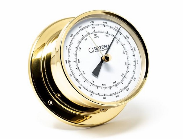 Precision Aneroid Barometer - type 'Datema' - 103 PM - diameter 5" - Messing - BrassAneroid barometer for measurement of the absolute atmospheric pressure. Precision movement with self-stable set of five aneroid capsules made of a copper-beryllium alloy.Measuring range 890 to 1050 hPaAccuracy ± 0.7 hPaGraduation 0.5 hPaThe aneroid capsules are nearly free of age-hardening, hysteresis and elastic after-effects. The influence of temperature on the set of aneroid capsules and the transmission system is compensated by a bimetal over the whole measuring range and for temperatures between -30 to +40 °C (-22 ... 104 °F). The motion of the aneroid capsule is transmitted to the axle of the pointer by driving a segment and wheel with an excellent fine finish of the gearing. All bearings have an excellent fine finish. The Instruments have only got a minimum of idle friction because of the advantageous shape of the levers and bearings.Case in polished or chromed brass, diameter 165 mm.Mineral glass cover.Faceplate:130mm ØHousing: 165mm ØHeight: 80 mmWeight:750 gr