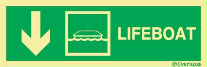 Safety sign; Direction lifeboat (Down from here) with