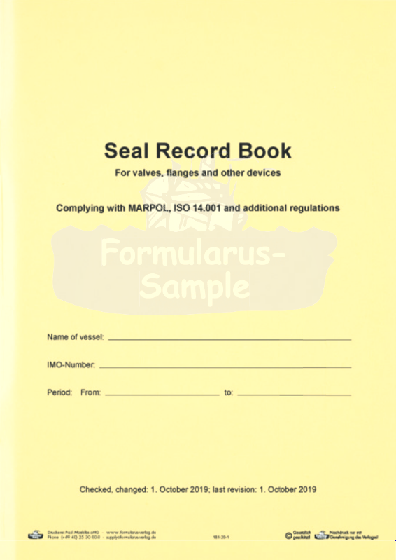 Seal Record Book Tables for receipt, stock and recording of sealing. Complying with MARPOL, ISO 14.001
