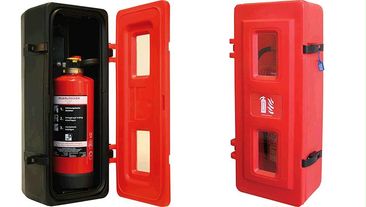 Box plastic for extinguisher black and red- Suitable for 6 kg fire extinguisher- Truck or wall mounting- Automotive grabe rubber seal- UV blocking moulded in polycarbonate windows- Left or right hinged mounting- Buckle web strap- Plastic toggles, lynch pins and hinge puns as standard